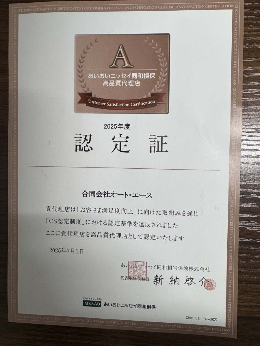 あいおいニッセイ同和損保様より認定証いただきました |